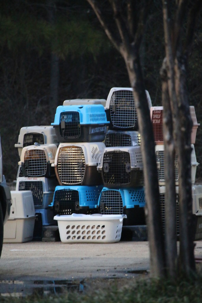 Stacks of kennels and animal carriers could be seen outside of the shelter on a normal day.